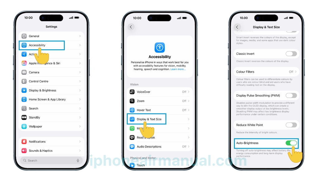 - Alternatively, enable Auto-Brightness (Settings → Accessibility → Display & Text Size).