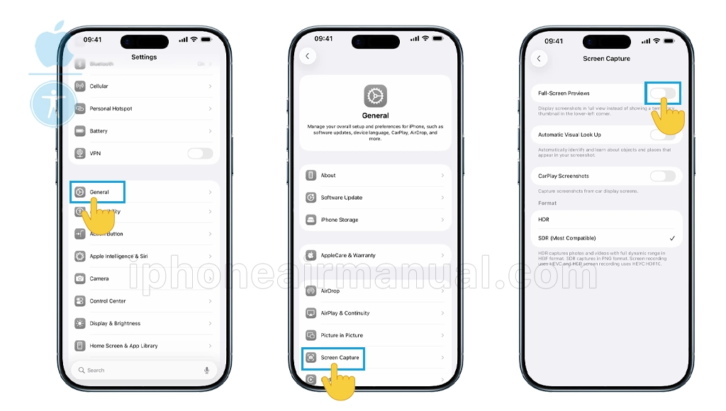 - Format Selection: Choose between HDR for vivid images with better color/contrast (screenshots saved in HEIC, recordings in HDR HEVC) or SDR (Most Compatible) for standard screenshots (saved as PNG, recordings in HEVC). HDR screenshots look best on compatible displays but are larger in file size.